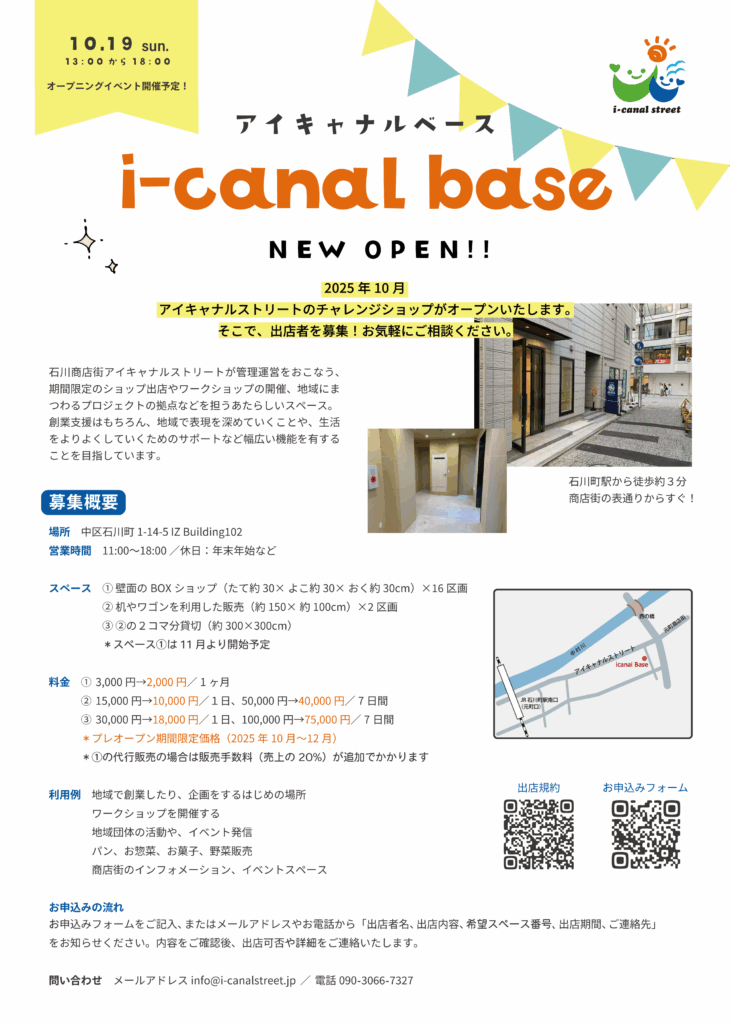 「i-canal base アイキャナルベース」は、石川商店街が管理運営をおこない、期間限定のショップやワークショップの開催、地域にまつわるプロジェクトの拠点などを担う新しいスペースです 。創業支援や地域で表現を深めていく事や、生活をよりよくしていくためのサポートなど幅広い機能を有することを目指します。